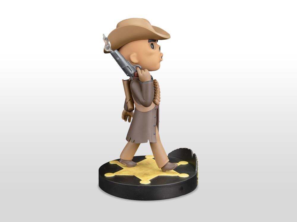 Vestido con su icónico traje vaquero, con un sombrero de vaquero marrón polvoriento y una gabardina, El Ghoul está listo para cobrar su recompensa. De pie sobre una base circular adornada con una estrella de sheriff amarilla, aparece pavoneándose mientras el humo sale del cañón de su pistola.