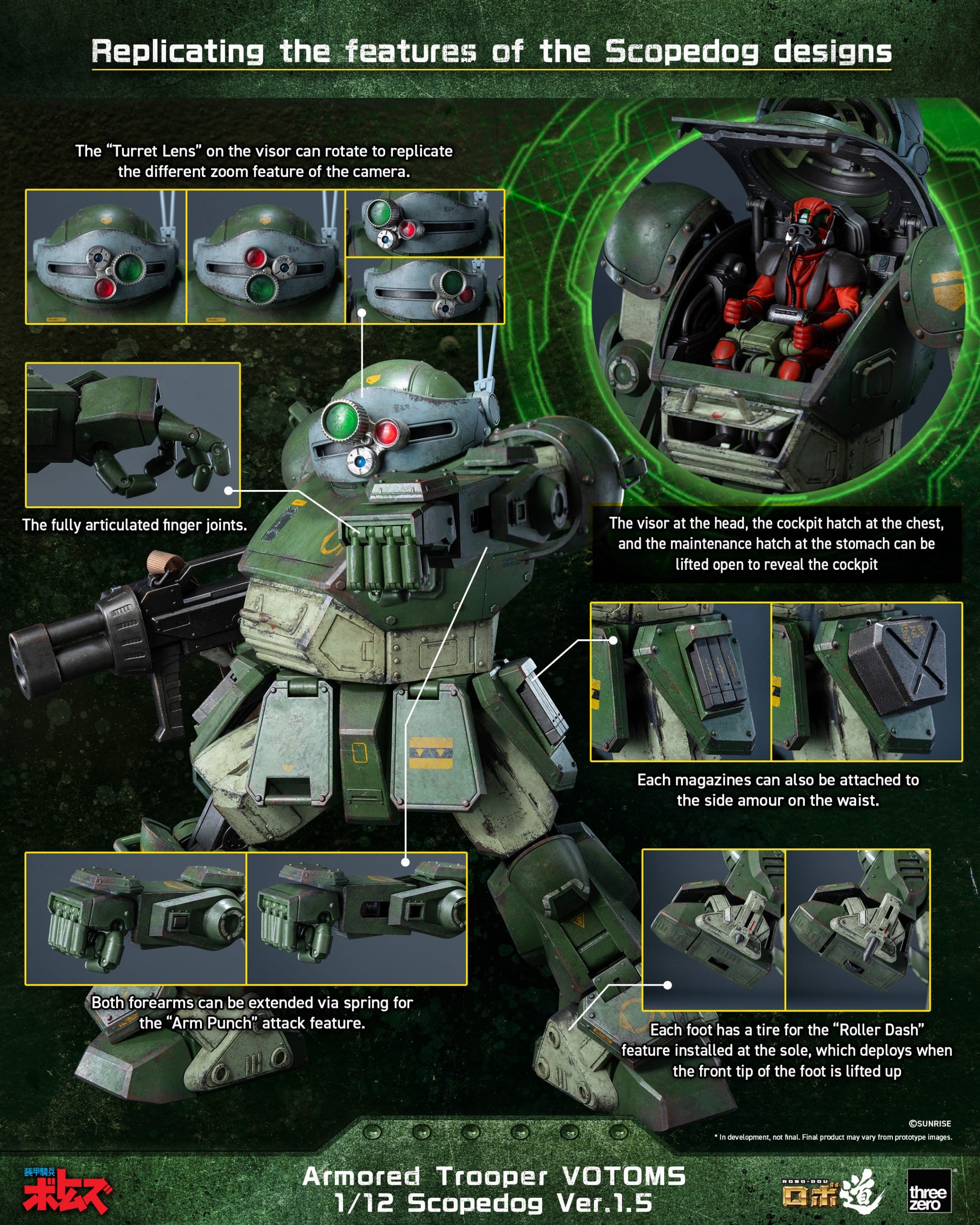 La figura Scopedog Ver.1.5 a escala 1/12 mide aproximadamente 33 cm (13 pulgadas) de alto. Presenta la detallada pintura con efecto desgastado característica de threezero y cuenta con aproximadamente 100 puntos de articulación. La visera, la escotilla de la cabina en el pecho y la escotilla de mantenimiento en el abdomen se pueden abrir para mostrar el interior de la cabina, donde se coloca la figura articulada del piloto. La lente de la torreta en la visera gira para simular las diferentes funciones de zoom de la cámara. Ambos antebrazos se extienden mediante un resorte para el ataque "Puñetazo con el brazo". Las articulaciones de los dedos son totalmente articuladas. Cada pie tiene una rueda en la suela para la función "Roller Dash", que se despliega al levantar la punta del pie. La palanca lateral de cada pie es extensible. Además, las piernas se pueden transformar para adoptar la posición de cuclillas, donde las articulaciones de la pelvis se ajustan verticalmente en 3 pasos para regular la longitud de las piernas. para la transformación en modo agachado y para una mayor articulación de las articulaciones.