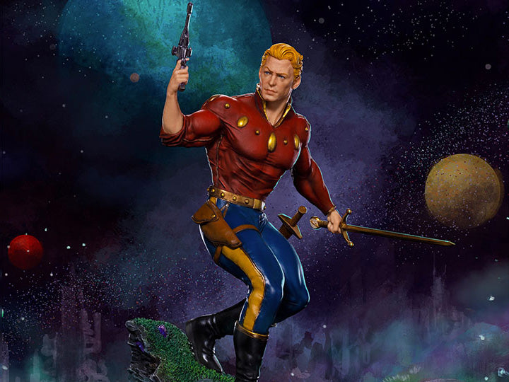 Flash Gordon es uno de los primeros héroes de cómics clásicos de la década de 1930 en obtener una estatua de Iron Studios. Sobre una base dorada decorada con un rayo, su símbolo, la estatua viene con una mano extra, con la opción de permitirle sostener su espada larga o no.