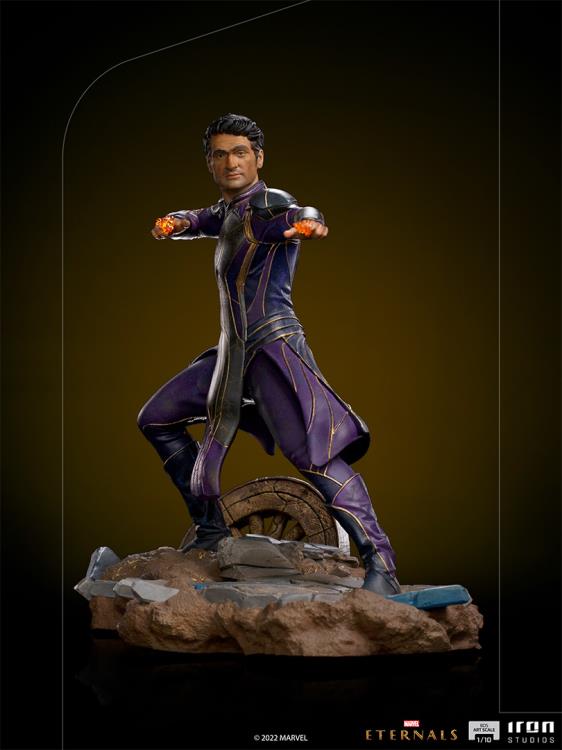 Confiado y siempre preparado para la acción, señala con el dedo dispuesto a disparar esferas de energía cósmica. Un combatiente extremadamente hábil con millones de años de entrenamiento y experiencia, se enamoró de los focos de la fama, la riqueza y la comodidad, estableciéndose en la India y convirtiéndose en una famosa estrella de la industria cinematográfica de Bollywood. Para ocultar su inmortalidad, fingió ser descendiente de un único linaje de actores. Con su armadura celestial violeta, Iron Studios trae la estatua de Kingo, con el actor, bailarín, director y superhéroe miembro de los Eternos en la lucha contra los Deviants.