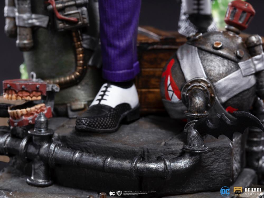 Sobre una base, posa como si caminara entre cilindros, conexiones y tuberías, en referencia a la escena de “Ace Chemical” en Gotham City, lugar de nacimiento del villano. Con un Batarang atrapado en una esfera metálica a sus pies, el Príncipe Payaso del Crimen, con su inconfundible sonrisa, porta una palanca en su puño derecho. Está dispuesto a disparar alguna sustancia química y ácida, de la flor de su solapa, otra de sus señas de identidad.