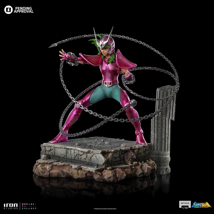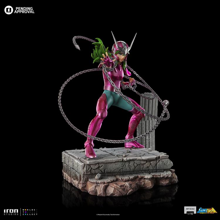 Con el extremo trigonal de su poderosa cadena listo para un ataque rápido y objetivo, siempre mirando hacia la dirección donde está el enemigo y siguiendo las órdenes de su mano derecha, y el otro extremo redondo de la cadena sostenido por su mano izquierda frente a su cuerpo, listo para defenderlo, el joven Santo se presenta con su paño rosa sobre un traje verde, reacio pero listo para la batalla. Sobre la base de los fríos escalones de piedra del Santuario, Iron Studios presenta con orgullo la estatua de Andrómeda Shun, con el más joven de los principales santos defensores de Atenas de bronce.