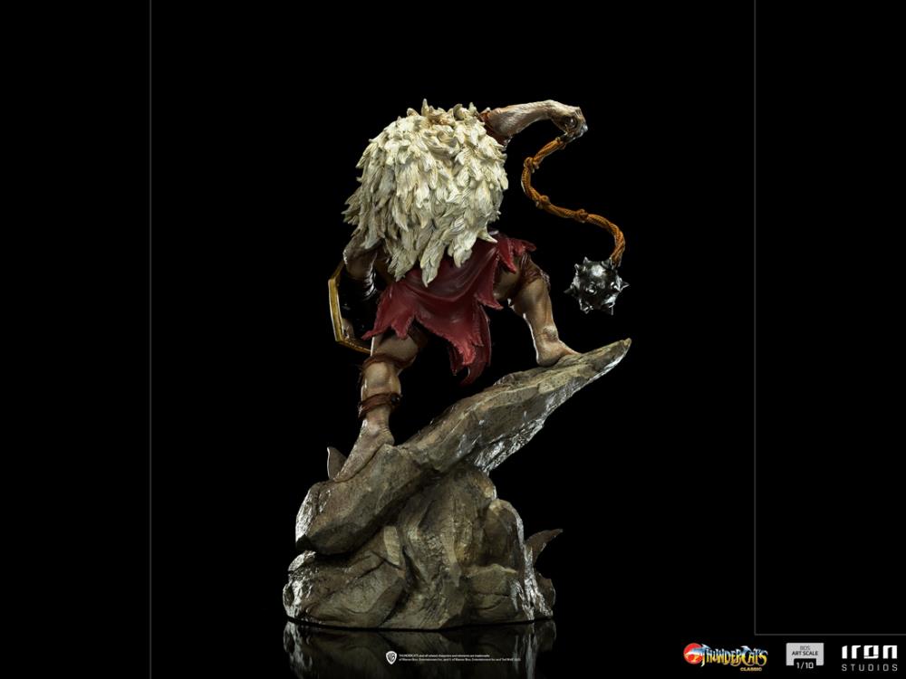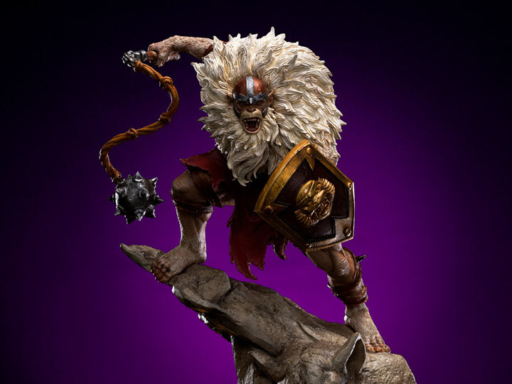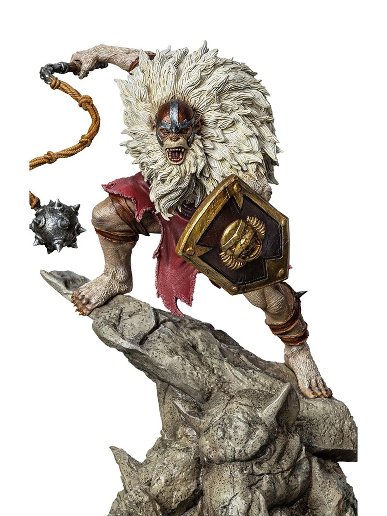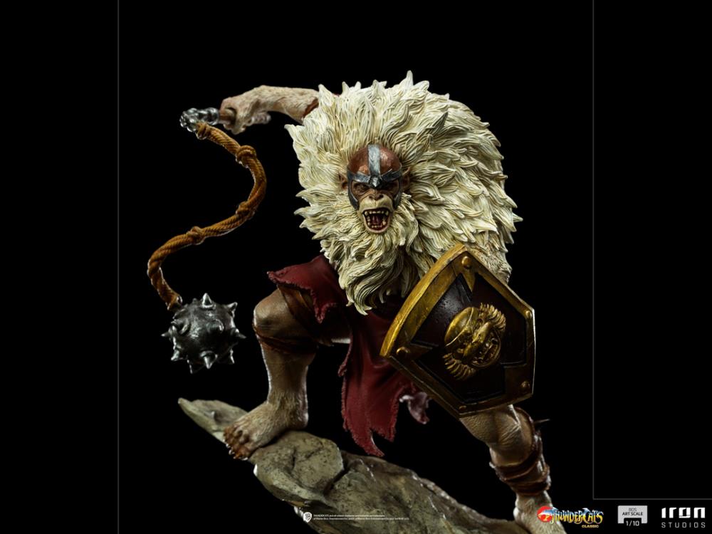 Con un espeso pelaje blanco que cubre su cuello y hombros, una figura musculosa parecida a un simio de intelecto limitado salta entre cantos rodados y rocas en el árido terreno de la Tercera Tierra, empuñando su Morning Star Mace, un arma que maneja con destreza. Protege su flanco izquierdo con su escudo, utilizado tanto para la defensa como para el ataque, capaz de disparar proyectiles. De esta forma, Iron Studios presenta su estatua Monkian BDS con el mono torpe y general de los Mutants, un grupo formado por diferentes razas de humanoides animales, que se encuentran entre los enemigos de los ThunderCats.