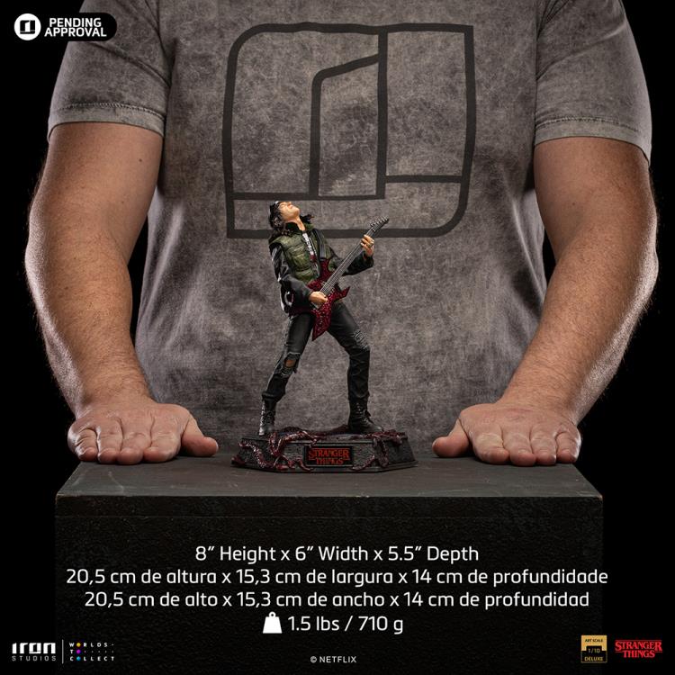 De la popular serie Stranger Things, llega la estatua de Eddie Munson a escala 1/10 de lujo de Iron Studios. Esta estatua mide alrededor de 20 cm de altura y muestra a Eddie Munson tocando la guitarra mientras está de pie sobre una base con temática de Stranger Things. ¡Asegúrate de agregar esta estatua a tu colección!